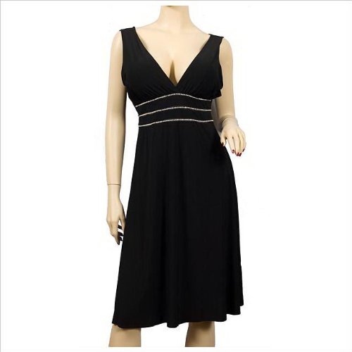 Add some style to your casual dressy wardrobe with this gorgeous plus size dress. Available in Jr plus sizes 1X, 2X, 3X, 4X, 5X. Women’s dress features sleeveless design with deep cut v-neck design. Boasts rhinestone lined empire waist. Partial open V-back for that sexy appeal. Skirt falls to the knee. Color is solid black.