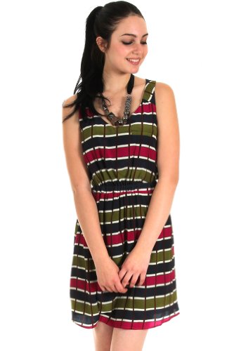 What proves ever so interesting about this dress is the smooth fabric’s pattern; the stripes are slightly zigzagged, thus moving with its pleated waistline. The bust displays a fake front pocket. and stretchy waist. Sleeveless and summery, its backside embraces the ocean-salt air with a triangle slit, pointed between the shoulder blades. The lower back is also revealed. Take this new look out on the pier or bike ride in the park.